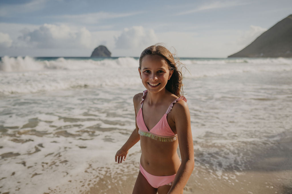 Conçu avec un tissu sans compromis de haute qualité, pour un toucher extrêmement doux et agréable. Un double volants scintillant qui longe les bretelles pour une sensation de légéreté. Parfait pour une baignade à la plage ou un plouf à la piscine.