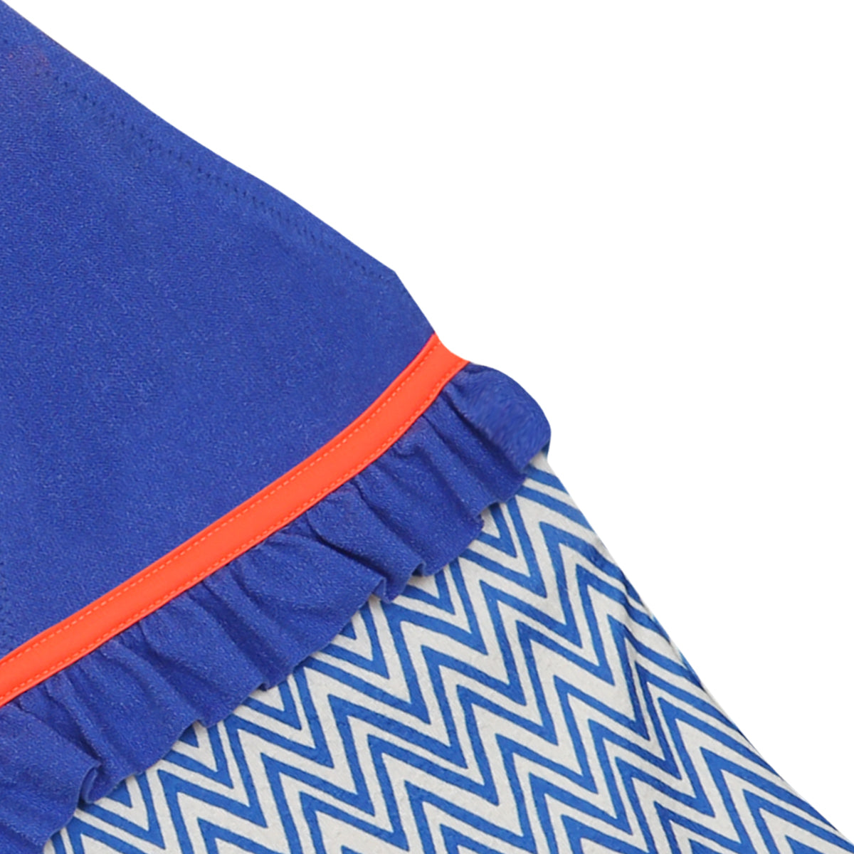 Ce maillot une pièce associe un haut uni bleu à dos croisé et un bas à motif chevron, souligné par un volant et une bande fluo contrastante. La silhouette est structurée par une encolure en V et des bretelles doubles. Le modèle réunit trois matières : un imprimé en 90 % de polyester recyclé (ECOYARN) et 10 % d’élasthanne, un uni bleu en 75 % de polyamide nylon et 25 % d’élasthanne, et un uni fluo composé de 78 % de polyamide recyclé et 22 % d’élasthanne. Une pièce graphique et confortable, pensée pour les baignades de l’été.