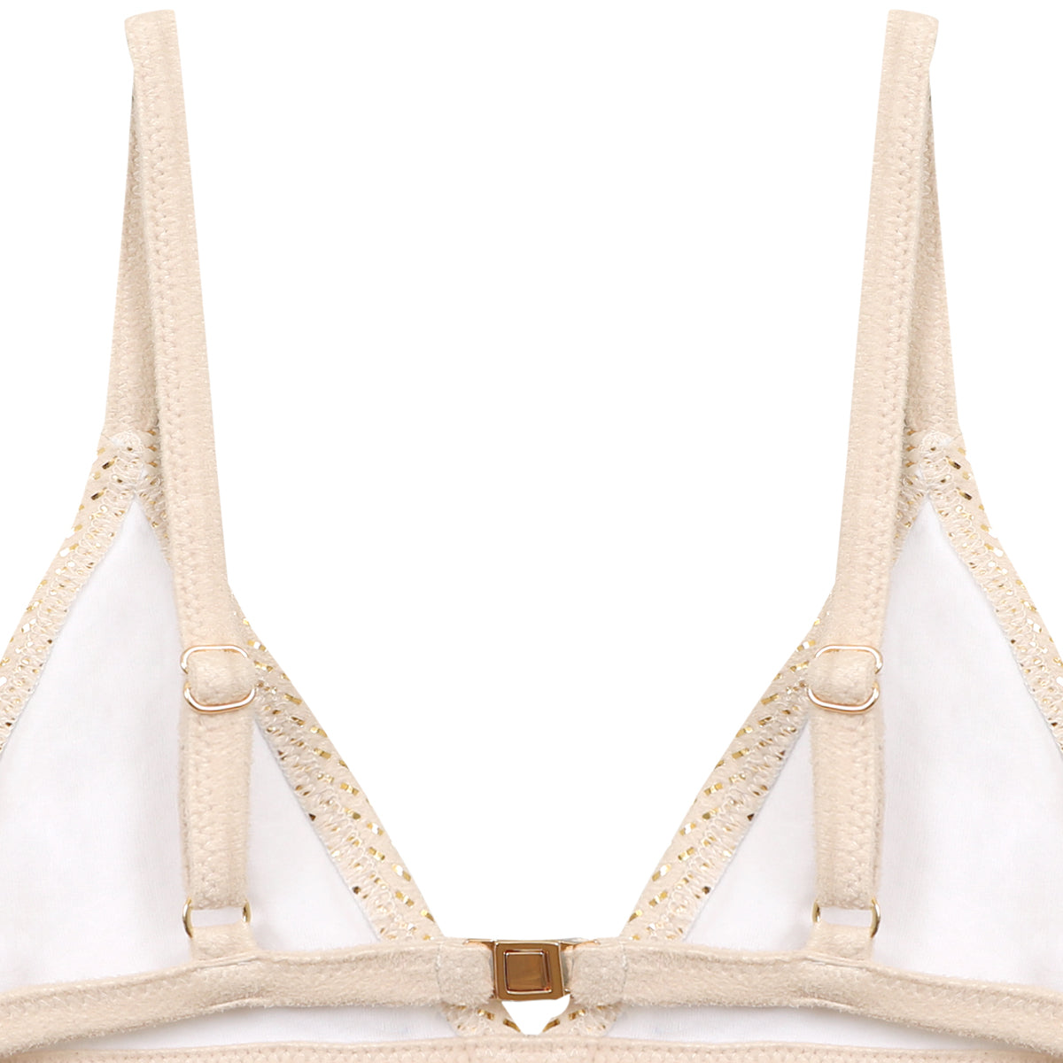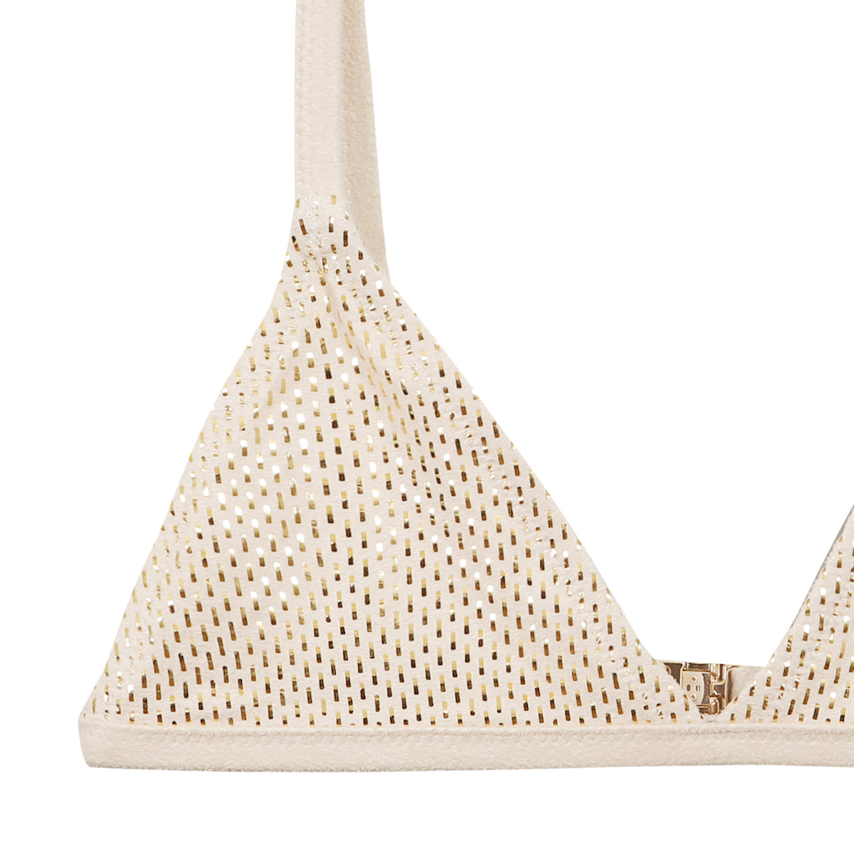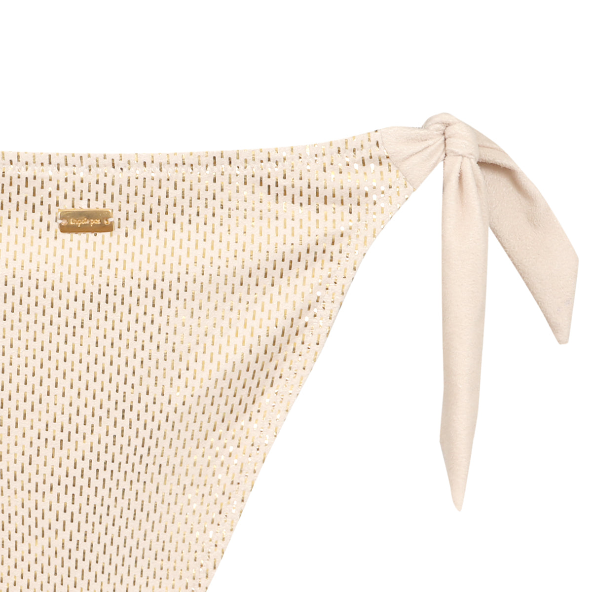 Ce bikini deux pièces associe un haut triangle classique à un bas à nouer sur les côtés. Son tissu doré métallisé reflète la lumière tout en conservant une finition douce et souple. Le modèle est confectionné à partir de 90 % de polyester recyclé (ECOYARN) et 10 % d’élasthanne, pour un confort optimal et un séchage rapide. Une silhouette ajustable, pensée pour les journées estivales ensoleillées.