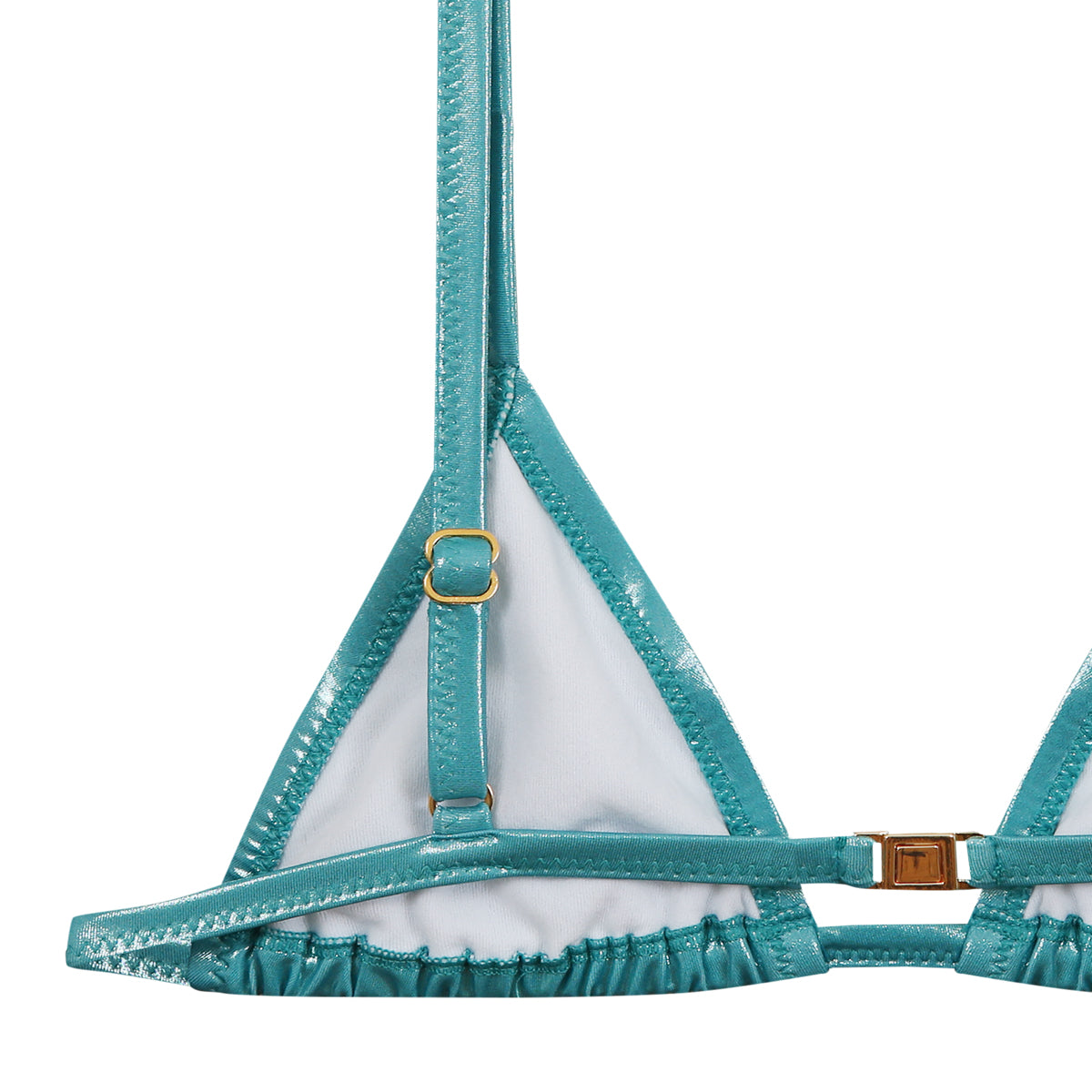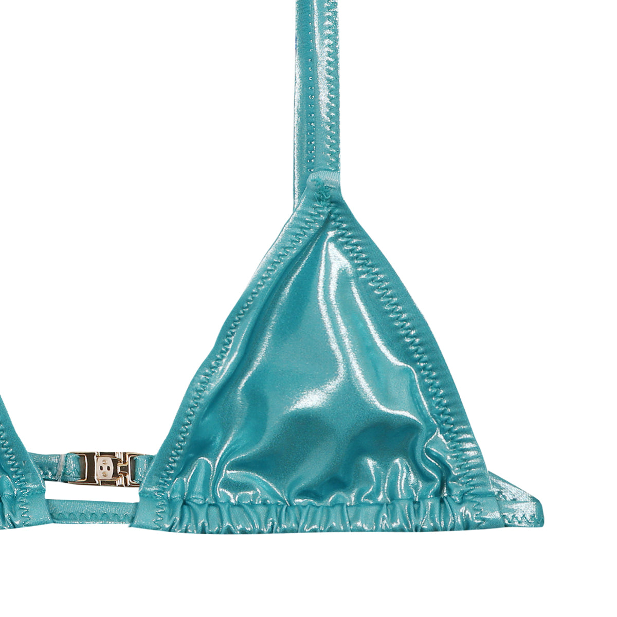 Ce bikini deux pièces associe un haut triangle à fines bretelles réglables et un bas à la coupe classique. Son tissu brillant met en valeur une teinte lagon intense, accentuée par un bijou doré au centre du haut. Confectionné à partir de 78 % de micro polyester et 22 % d’élasthanne, ce modèle assure confort, souplesse et maintien. Une silhouette lumineuse, pensée pour les journées d’été sous le soleil.