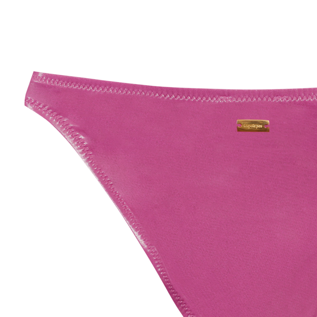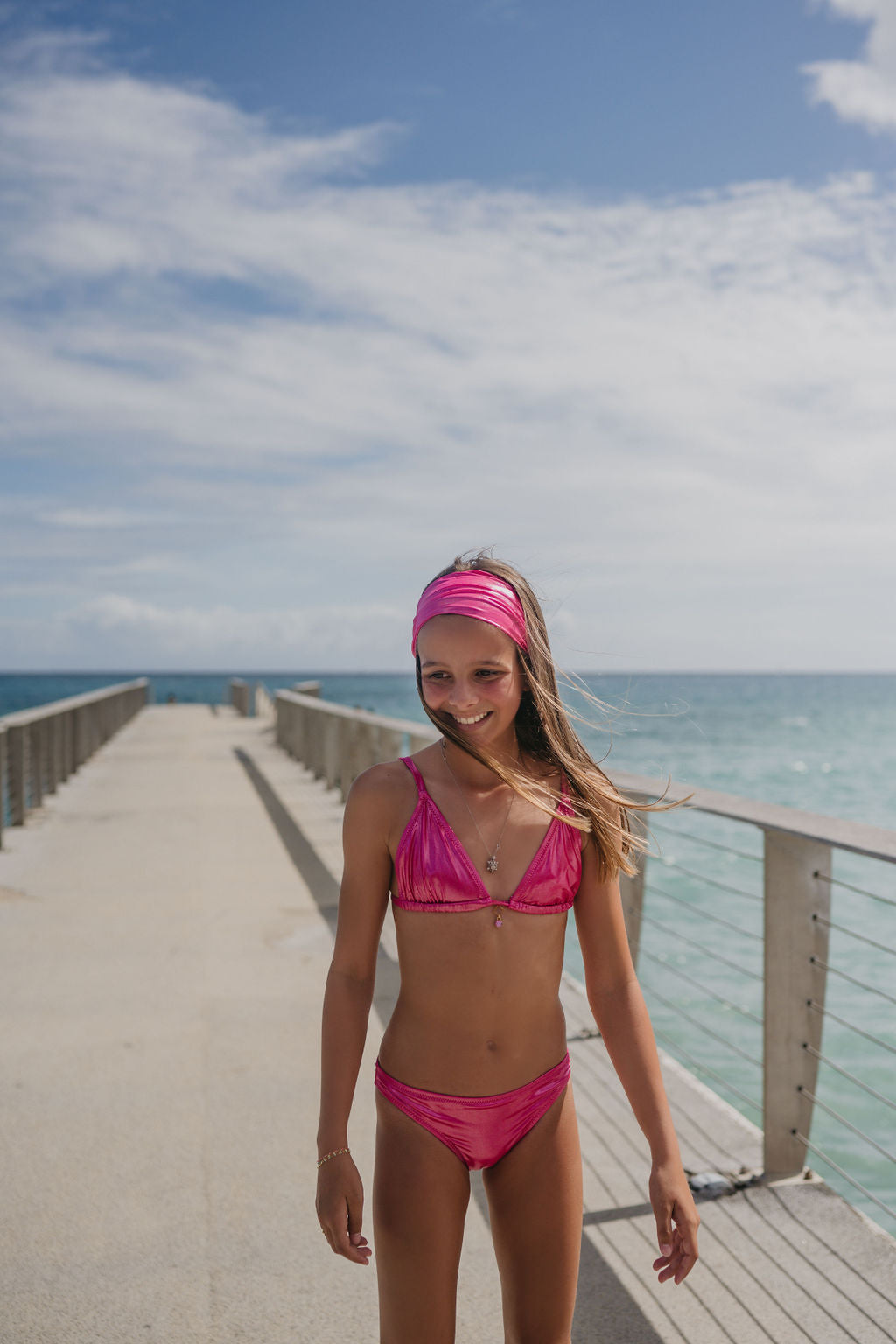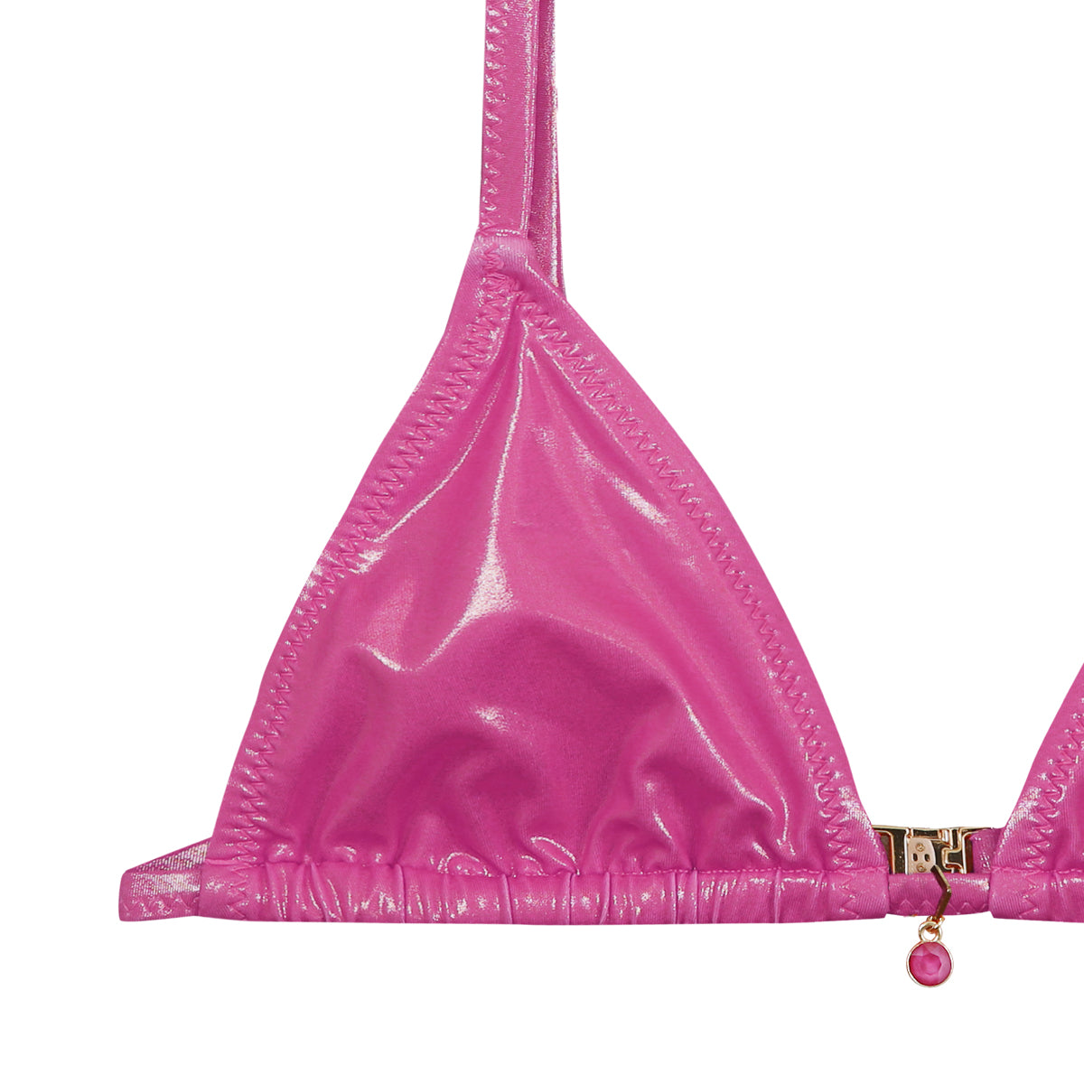 Ce bikini deux pièces se compose d’un haut triangle à fines bretelles réglables et d’un bas assorti à la coupe classique. Son tissu brillant révèle une teinte pastèque éclatante, soulignée par un bijou doré discret au centre du haut. Confectionné à partir de 78 % de micro polyester et 22 % d’élasthanne, ce modèle assure confort, maintien et liberté de mouvement. Une silhouette lumineuse pensée pour l’été.